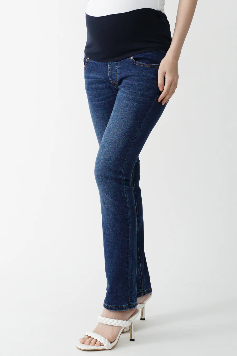Wide jersey waistband to wear under or over the bump